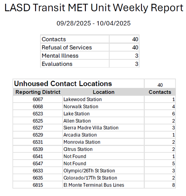 Transit Services Bureau (TSB) Deputies responded to the Lynwood Metro Passenger Station regarding a grand theft report call for service. Upon arrival, Deputies contacted a Metro Supervisor who informed them 45 feet of copper wire was missing from the train tracks. The Metro Supervisor was unable to provide a date for the last track inspection prior to discovering the missing copper wire. The Metro Supervisor estimated the cost of replacing the copper wire to be $2,025.00. TSB Deputies were unable to locate the suspect. The suspect is still outstanding.